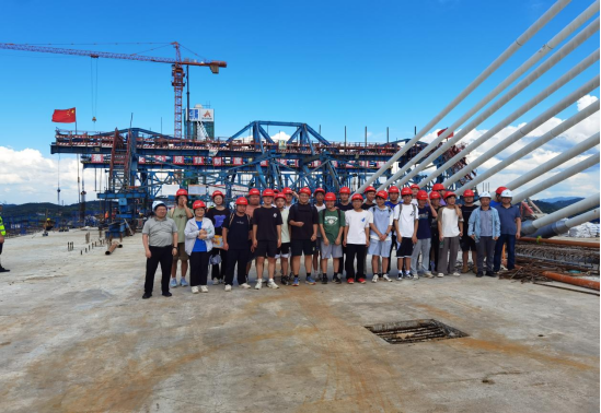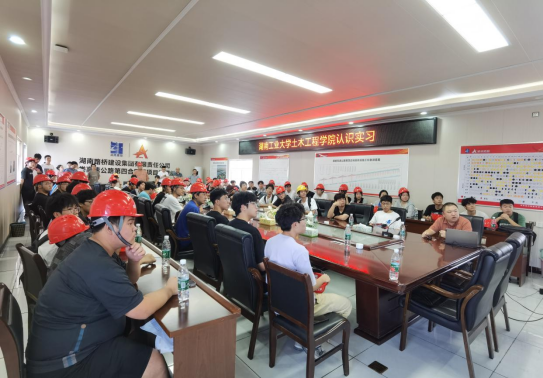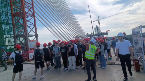 在现场实习过程中,曹磊老师首先介绍了该项目总工曾超,对此次实习活动安排表示感谢,并简要介绍了本次实习目的、安全注意事项及现场实习安排。项目总工曾超以动画视频的形式生动形象地介绍了该项目概况和施工进展,并结合施工现场的大量图片详细讲解了施工过程中的关键技术,同时,也介绍了土木工程专业的未来发展,给同学们上了一堂非常精彩的课。学生与企业的相关技术人员进行了深入交流。随后,同学们参观了项目部的生活区及办公区的情况,并参观了钢筋的加工现场。接着,同学们来到了桥梁的施工现场参观学习。