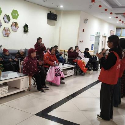 活动中,志愿者们用精心编排的手势舞营造了节日的欢快氛围。他们在养老院的活动室里整齐列队,随着音乐的节奏,灵动的手指翩翩起舞,脸上洋溢着温暖的笑容。老人们围坐一旁,跟着节奏摇摆。一时间,活动室里充满了温馨与欢乐。