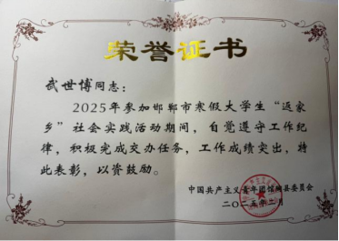 实践内容:2025年12月31日至2025年2月6日,武世博积极响应共青团号召,回到了家乡馆陶县参与志愿服务实践。主要工作包括:协助团县委开展暖心助残服务、家乡文化宣讲、惠民政策宣发、“双节”送温暖等志愿服务活动。