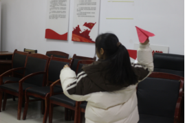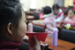 在纸飞机的试飞阶段,志愿者指导小朋友们认真践行纸飞机的飞行原理,思考自己制作的纸飞机在飞行中的优缺点,总结经验,不断改良。