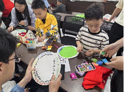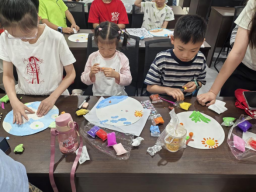 创意手工环节更是精彩呈现。志愿者们为每组小朋友分发了色彩斑斓的超轻粘土和精致的圆卡纸,耐心指导大家制作小满主题粘土画。不一会儿,一幅幅充满童趣的粘土画跃然纸上,孩子们高举作品,兴奋地向同伴展示,眼中满是自豪,现场洋溢着浓厚的艺术氛围与创作热情。