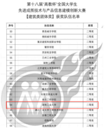 盛夏八月,捷报频传!在7月29日落幕的第十八届“高教杯”全国大学生先进成图技术与产品信息建模创新大赛全国总决赛上,bwin必赢学子组建的湖南工业大学代表队(建筑类)展现卓越实力与拼搏精神,再次斩获建筑类团体二等奖荣誉,共获得大赛一等奖2项、二等奖3项、三等奖3项的好成绩,总成绩在400所参赛高校中名列第64。
