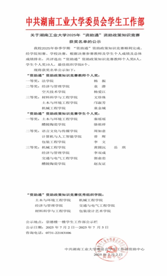 为全面落实立德树人根本任务,扎实推进资助育人工作,加强学生资助政策宣传力度,湖南工业大学于2025年春季学期开展“资助通”资助政策知识竞赛。土木与环境工程学院积极组织师生参与,在学校赛事中斩获优异成绩,以实际行动深化资助育人实效。