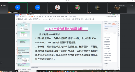 听课老师们认真记录,积极总结,课后采取腾讯会议的方式进行了线上评课交流。大家一致认为黄润德老师工程经验丰富,理论基础扎实,对课程内容非常熟悉,课堂讲解详细深入。但同时,也针对存在的不足提出了建议,主要是:(1)钢结构课程理论深、公式多,学习难度大,需抓住重点,整理出知识点的逻辑性,随时注意归纳对比,用深入浅出的方式引导初学者逐步进入艰深的专业学习;(2)注重结合工程实例授课,多用工程图片、三维展示等帮助学生理解节点构造,对照实际工程的设计图讲解设计要点;(3)加强线上教学互动,多用算例训练调动学生的参与度。尤其是针对如何加强教学互动,听课老师们展开了激烈讨论,分享了各自的经验和体会。