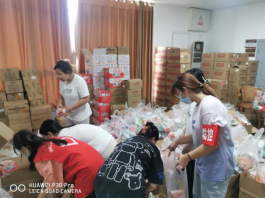 将四十多种类一千一百多件商品按照等价原则打包成一千七百多袋物资,是一个非常巨大的工程。因此,学工办召集了三十余位志愿者协助分配。为了能够让同学们快点拿到物资,志愿者们不舍昼夜,拆箱装包,忙得晕头转向,眼花缭乱,累得倒头就睡,奋斗了一天半才终于完成此项艰巨的任务。