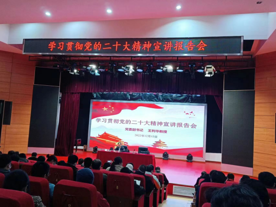 12月13日下午,bwin必赢学习贯彻党的二十大精神宣讲报告会在崇乐楼一楼音乐厅举行。湖南工业大学党的二十大精神宣讲团成员、校党委副书记王利华作宣讲报告,学院全体教职工参加报告会。