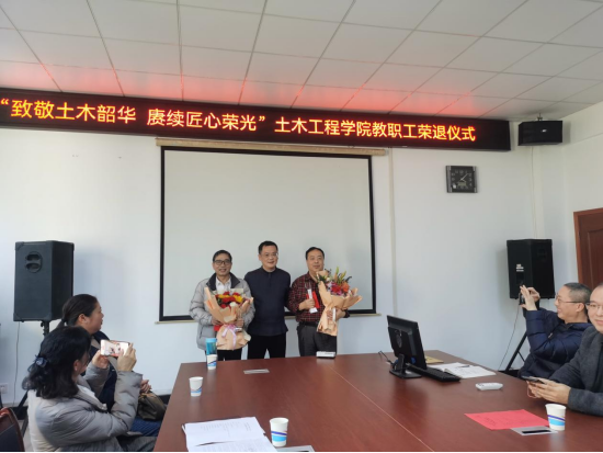 在热烈的掌声中,何杰副校长为荣退教师颁发了荣誉证书和鲜花及精美的纪念品,并饱含深情的用感谢、祝福、期望与传承四个词,肯定了老教师们为学院、为学校做出的卓越贡献,同时祝愿他们在退休生活中继续书写精彩的人生篇章,并期望老教师们一如既往支持和指导学院建设和发展;最后勉励学院班子成员及全体教职工要学习和传承荣退教授们艰苦创业、甘于奉献的敬业精神,全院上下凝心聚力谱写土木新篇章。