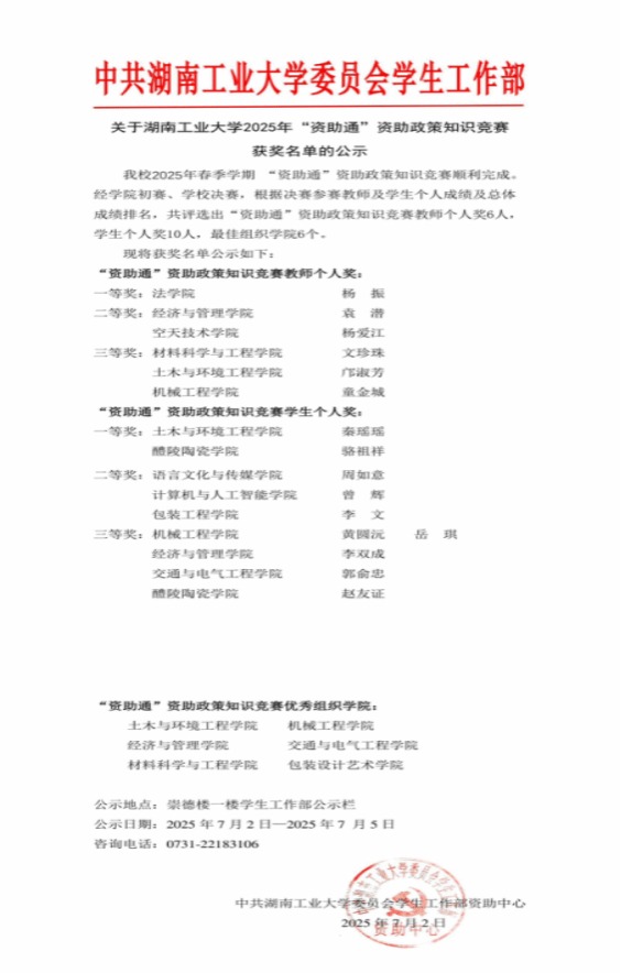 为全面落实立德树人根本任务,扎实推进资助育人工作,加强学生资助政策宣传力度,湖南工业大学于2025年春季学期开展“资助通”资助政策知识竞赛。土木与环境工程学院积极组织师生参与,在学校赛事中斩获优异成绩,以实际行动深化资助育人实效。